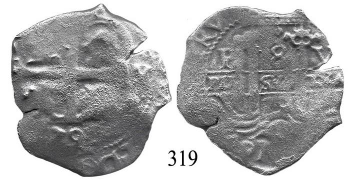 Potosí, Bolivia, cob 8 reales, 1679V. S-P39. 17.5 grams. Full pillars, full but worn cross, 3 dates, 2 small edge-splits, thin from corrosion. Recovered from: Consolación, sunk in 1681 off Santa Clara Island, Ecuador. With photo-certificate.