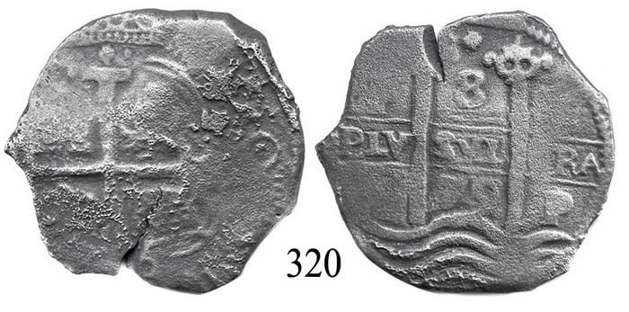 Potosí, Bolivia, cob 8 reales, 1679V. S-P39. 19.9 grams. Nice full pillars-and-waves, full but off-center cross, edge-split and some corrosion. Recovered from: Consolación, sunk in 1681 off Santa Clara Island, Ecuador. With photo-certificate.