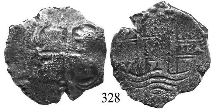 Potosí, Bolivia, cob 8 reales, 1679V. S-P39. 18.7 grams. Full pillars-and-waves, corroded cross, crude edge. Recovered from: Consolación, sunk in 1681 off Santa Clara Island, Ecuador. With ROBCAR photo-certificate.