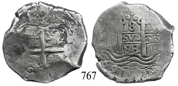 Potosí, Bolivia, cob 8 reales, 1693VR. S-P40. 27.0 grams. Somewhat chunky flan with full pillars and (especially) waves, full 1693 date in legend and bold 93 in center, nearly full but slightly crude cross, toned VF with flat spots.