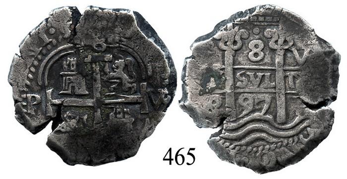 Potosí, Bolivia, cob 8 reales, 1697VR. S-P40. 25.5 grams. Thick and solid (uncorroded) planchet with choice full pillars-and-waves, nearly full cross, 3 mintmarks, nice toning, two edge-splits. Recovered from: Spanish 1715 Fleet, east coast of Florida. With Real Eight Co. certificate signed by Bob Johnson.