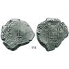 Potosí, Bolivia, cob 8 reales, 1722Y. S-P43a, KM-31, CT-882. 24.9 grams. Bold main date between full pillars, full second date below flat cross, typically thick and chunky, appears to be uncorroded but piece of edge probably missing. Pedigreed to the Mark Bir collection. Recovered from: Princess Louisa, sunk in 1743 off the Cape Verde Islands, west of Africa