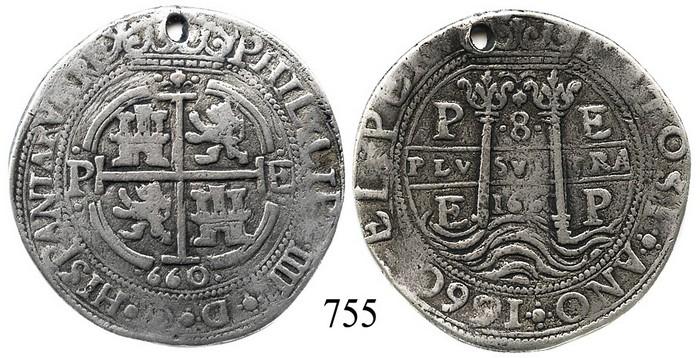 Potosí, Bolivia, cob 8 reales Royal, 1660E, very rare. S-P37a. 26.2 grams. Perfectly round and well centered on a broad flan, and much more evenly struck than the regular cobs, this Royal has the distinction of being one of the few issues with full 4-digit date between the pillars (Lázaro #162, "very rare…3 to 4 specimens known," value $10,000), in this case possibly to mirror the "Star of Lima" design of the same date, all details (including legends) very clear despite a few weak areas, AVF, lightly toned on fields that show traces of old gilding, holed at top of cross side (very typical).