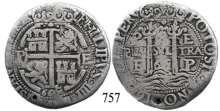 Potosí, Bolivia, cob 8 reales Royal, 1665E, extremely rare. S-P37a. 24.6 grams. Well centered on a broad, round flan of even thickness (as usual), with full details nicely accentuated by toning on fields, yet worn (Fine) and underweight (probably lightly shaved), with tiny hole at edge, still rather rare (Lázaro #172, "extremely rare...[no] more than 3 specimens known," value $20,000).