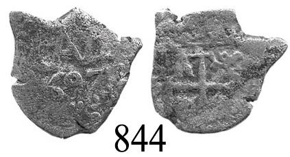 Potosí, Bolivia, cob ½ real, 1697. KM-22. 1.5 grams. Odd shape, full monogram and date, Fine with light corrosion from unspecified salvage.
