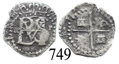 Potosí, Bolivia, cob ½ real, Philip II, small R (Ramos) to left, P to right, scarce. S-P13. 1.3 grams. Bold full monogram and crown with tiny P to right, full cross, nicely toned but slightly oxidized (net AVF).