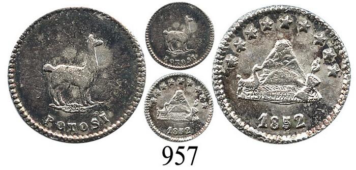 Potosí, Bolivia, ¼ sol, 1852. KM-111. 0.7 gram. AU with spotty rainbow toning.