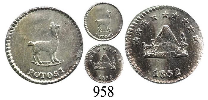 Potosí, Bolivia, ¼ sol, 1852. KM-111. 0.8 gram. AU with patches of dark toning.