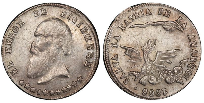 Potosi, Bolivia, 1/16 melgarejo, 1868, PCGS AU53. Burnett-113; Fonrobert-unl. Obverse with bare bust of Melgarejo facing left within legend EL HEROE DE DICIEMBRE with arc of eleven stars at bottom; reverse with dragon under sword within legend SALVA LA PATRIA DE LA ANARQUIA 1868. (a design from 1865, per Burnett 103); reeded edge. Bold and slightly off-center strike with minimal toning and luster but hardly any actual wear. PCGS #32906172. The Whittier Collection of Bolivian Monetary Medals