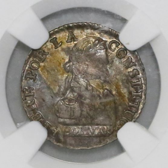 Potosi, Bolivia, 1/2 sol, 1830JL, six-point stars, NGC MS 62. KM-93.2a. Beautifully rainbow toned over muted luster, nice bust of Bolivar but other side slightly crude on high points (decidedly not wear). NGC #3897183-002.