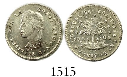 Potosi, Bolivia, 1/2 sol, 1862FP. KM-133.2 1.31 grams. Choice Mint State with brilliant luster.