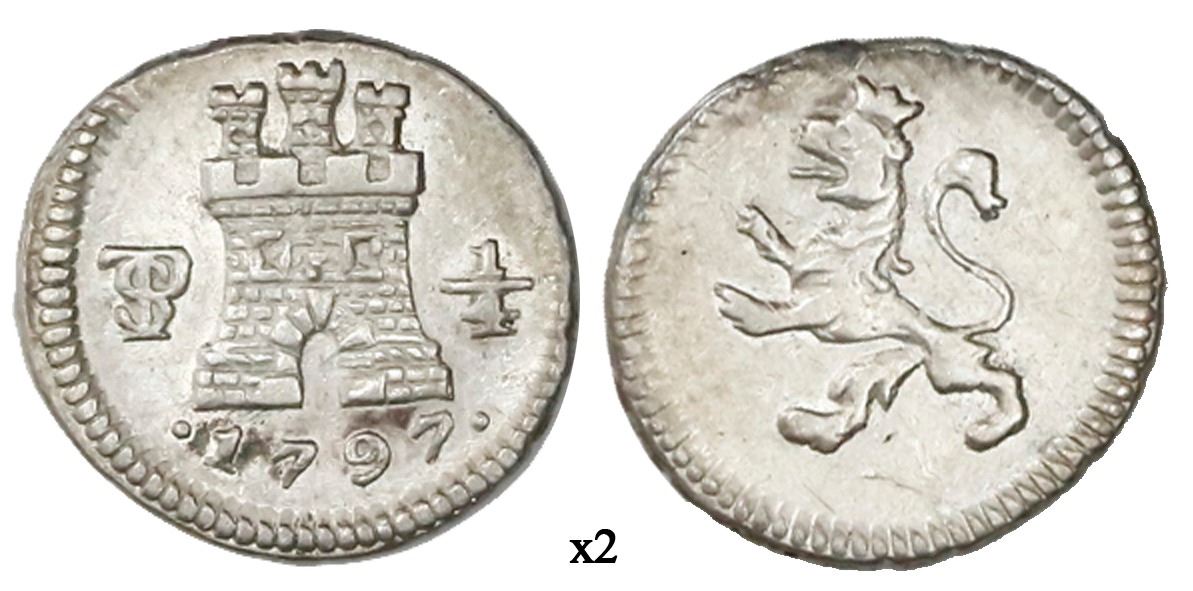Potosi, Bolivia, 1/4 real, 1797. Janson-81.4.2; KM-82; CT-1412. 0.84 gram. AU+ with nice luster, mostly bold rims (the flan extending past the rim on obverse).