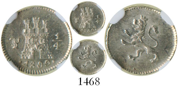Potosi, Bolivia, 1/4 real, Ferdinand VII, 1809, encapsulated NGC MS 63, finest known specimen graded by NGC, very rare. CT-unl.; KM-82; Janson-81.16. There are some key dates in the milled 1/4R series, but none more important than the last year (1809), and this specimen is the finest on record (catalog value of $4000 in KM), with perfect details and nice clean fields, even good rims apart from a wisp of die-clashing at the reverse rim, no toning, just luster and the pride that comes with owning the best!