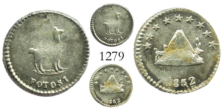 Potosi, Bolivia, 1/4 sol, 1852. KM-111. 0.5 gram. AU with weal centers, much luster, rainbow toning.