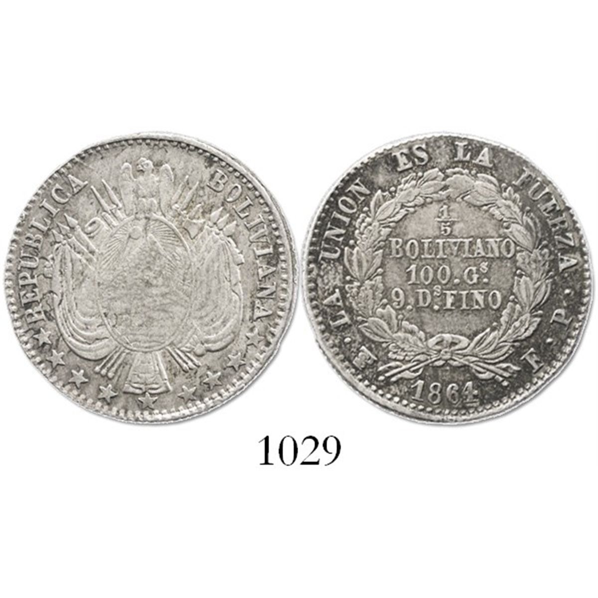 Potosi, Bolivia, 1/5 boliviano, 1864FP.