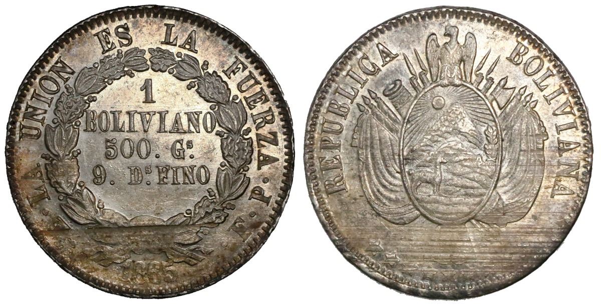 Potosi, Bolivia, 1 boliviano, 1865FP.