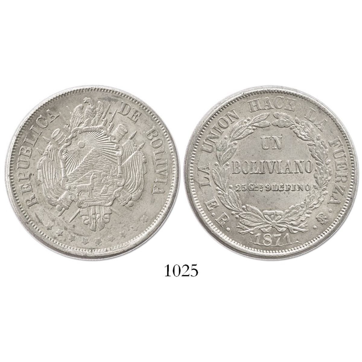 Potosi, Bolivia, 1 boliviano, 1871ER, encapsulated NGC MS 62. KM-155.3. Lustrous and attractively toned all over.