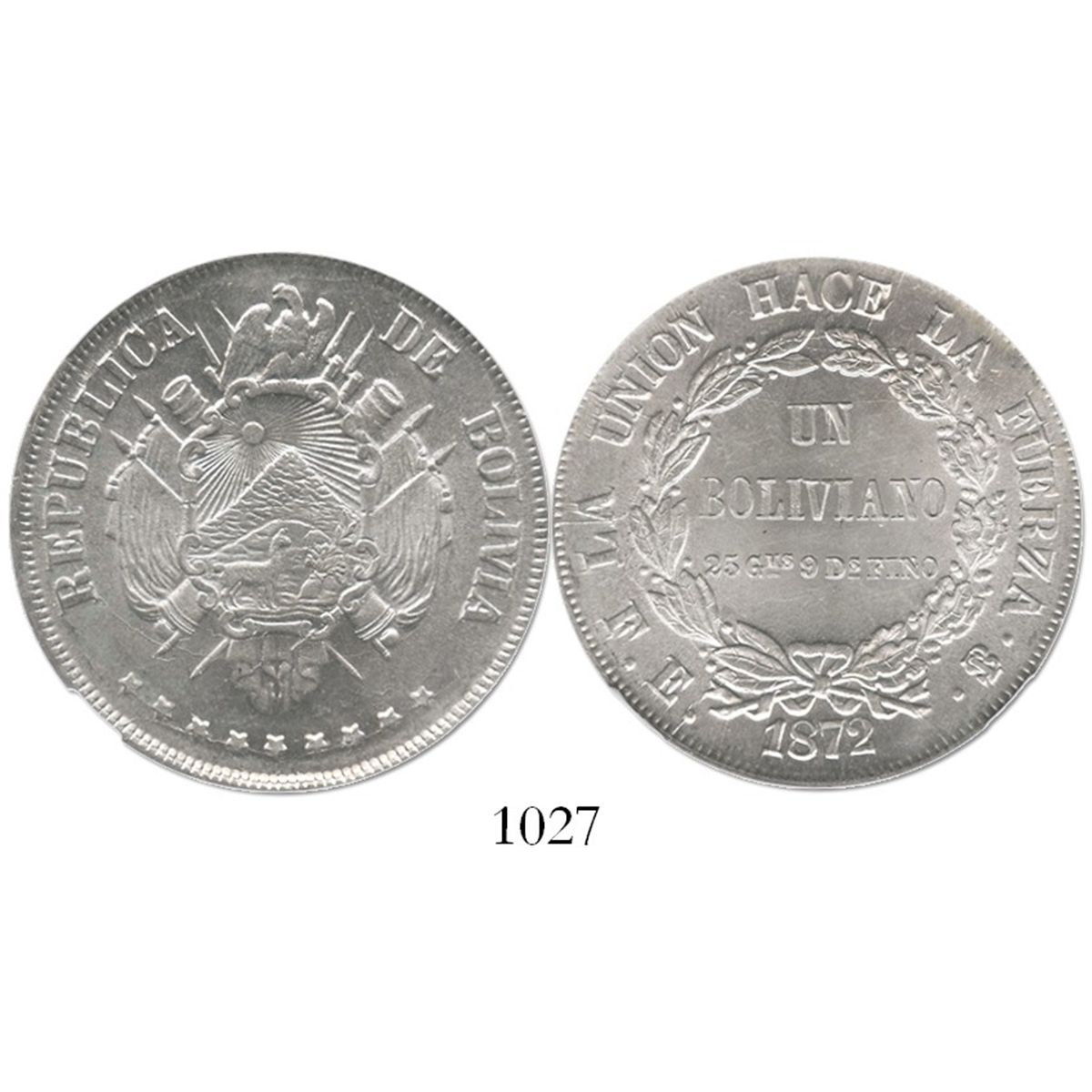 Potosi, Bolivia, 1 boliviano, 1872FE, encapsulated NGC MS 63. KM-155.4. Brightly lustrous, with several small die-cracks.