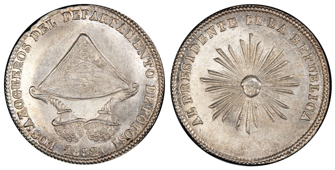 Potosi, Bolivia, 1 sol, 1852, Belzu / refiners / Bacchus sunface, PCGS MS64. Burnett-53; Fonrobert-9577. Obverse with Cerro de Potosi over two cornucopias within legend LOS AZOGUEROS DEL DEPARTEMENTO DE POTOSI and 1852 date at bottom (with traces of 0 between date and POTOSI); reverse with radiant Bacchus sunface within legend AL PRESIDENTE DELA REPUBLICA; reeded edge. Brilliantly lustrous with choice full strike, no toning, no wear or marks at all. PCGS #32915196. The Whittier Collection of Bolivian Monetary Medals