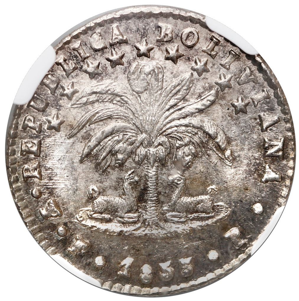 Potosi, Bolivia, 1 sol, 1853 FP, NGC MS 64. KM-119.1. Bold strike with sharp details, faintly toned over strong luster, currently tied with two others for second finest in NGC census behind a single MS 65.
