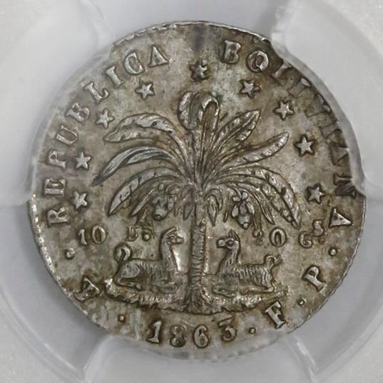 Potosi, Bolivia, 1 sol, 1863/2FP, PCGS AU58, finest known in PCGS census.