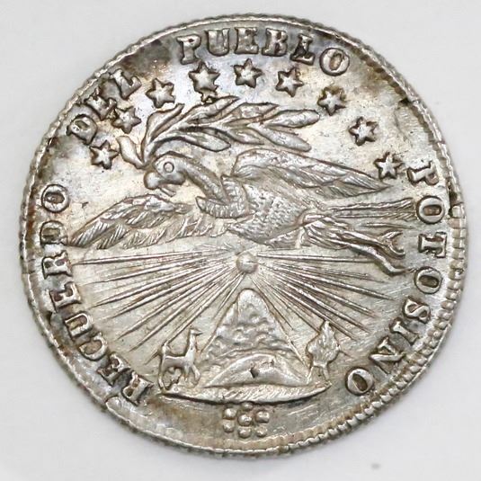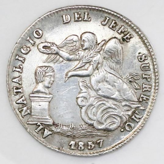 Potosi, Bolivia, 1 sol-sized silver proclamation medal, 1857, Cordova / Linares, ex-Cotoca. Burnett-79b; Fonrobert-9623; Bosco-40.2. 3.64 grams. Medallic commemorative coinage for the birthday of the Supreme Leader (President Jorje Cordova) on July 10. The bust receiving the laurels is a portrait of Cordova. Cleaned AU. Pedigreed to the Cotoca collection.
