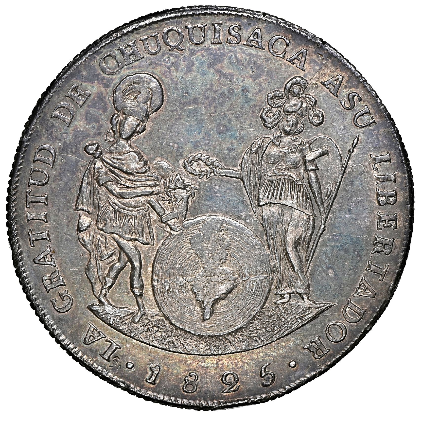 Potosi, Bolivia, 10 soles-sized monetary medal, 1825, Chuquisaca, NGC MS 61. Burnett-6A; Fonrobert-9741. Obverse with bust of Bolívar inside legend PADRE DE LA PATRIA SIMON BOLIVAR; reverse with soldier and woman flanking globe inside legend . LA GRATITUD DE CHUQUISACA A SU LIBERTADOR . with 1825 date at bottom. Deep rainbow toning over muted luster, with minimal marks and slight wear on highest points, scarce and desirable issue as from the first series of Bolivian monetary medals struck after independence. (Note: NGC labeled this erroneously as Fonrobert-9740, which refers instead to a higher-weight version.) NGC #4927252-007. Pedigreed to the Gran Colombia collection.
