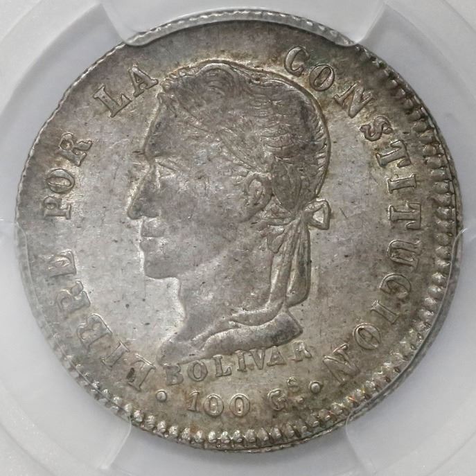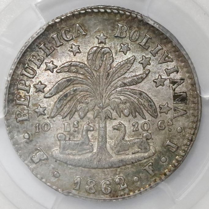 Potosi, Bolivia, 2 soles, 1862/1FJ, PCGS AU58, finest known in PCGS census. KM-135.2. Finest known at PCGS with the other graded VF20; none seen at NGC. Light wear on high points, some luster with colorful rainbow toning. PCGS #36271754.