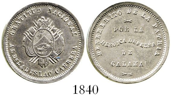 Potosi, Bolivia, 20 centavos silver medal, (1879), Cabrera, ex-Derman. Salbach-1585. 4.7 grams. Obverse with Bolivian arms within legend GRATITUD NACIONAL AL DR. LADISLAO CABRERA; reverse with BENEMERITO DE LA PATRIA POR LA HEROICA DEFENSA DE CALAMA; nice UNC. Pedigreed to the Alberto "Coco" Derman collection (Cayon auction of December 2007, with original lot-tag #668).