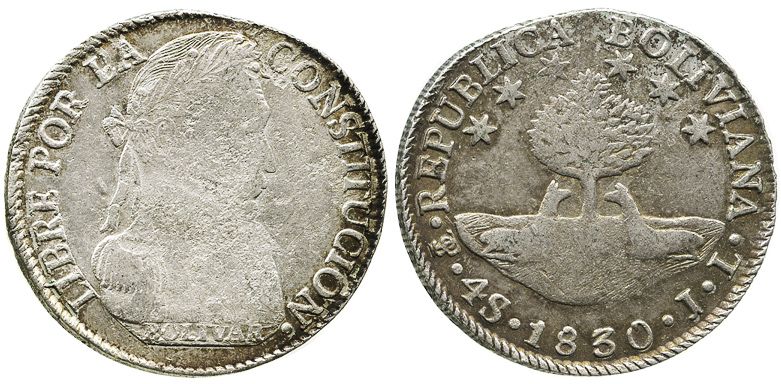 Potosi, Bolivia, 4 soles, 1830JL, medal alignment. KM-96a.1. 13.3 grams. Lustrous XF with typically very weak centers, rich golden toning at rims, slightly crude at top (as made), clear AYACUCHO on edge.