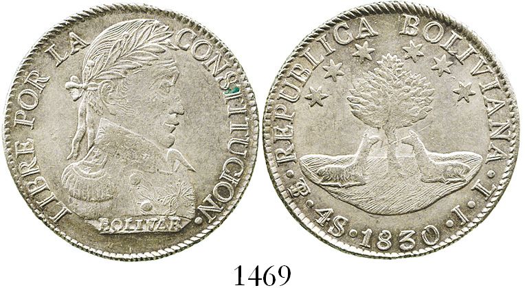 Potosi, Bolivia, 4 soles, 1830JL. KM-96a.1. 13.3 grams. Lustrous UNC with hairlines in field in front of bust, light old scratch on tree trunk, relatively good strike.