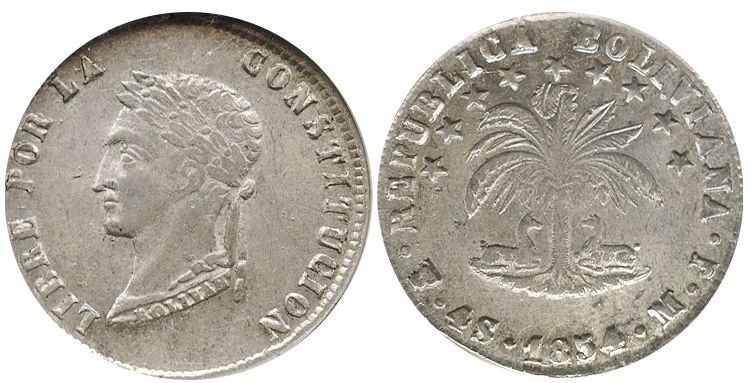 Potosi, Bolivia, 4 soles, 1854MJ, encapsulated NGC AU 58. KM-123.2. Lustrous and well struck, effectively Uncirculated, among the top ten specimens graded by NGC.