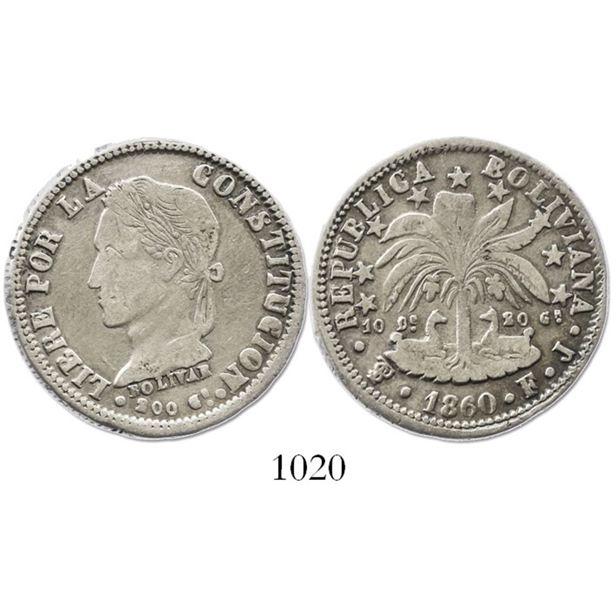 Potosi, Bolivia, (4 soles), 1860FJ, rare. KM-139. 9.8 grams. AVF with luster and toning around legends.