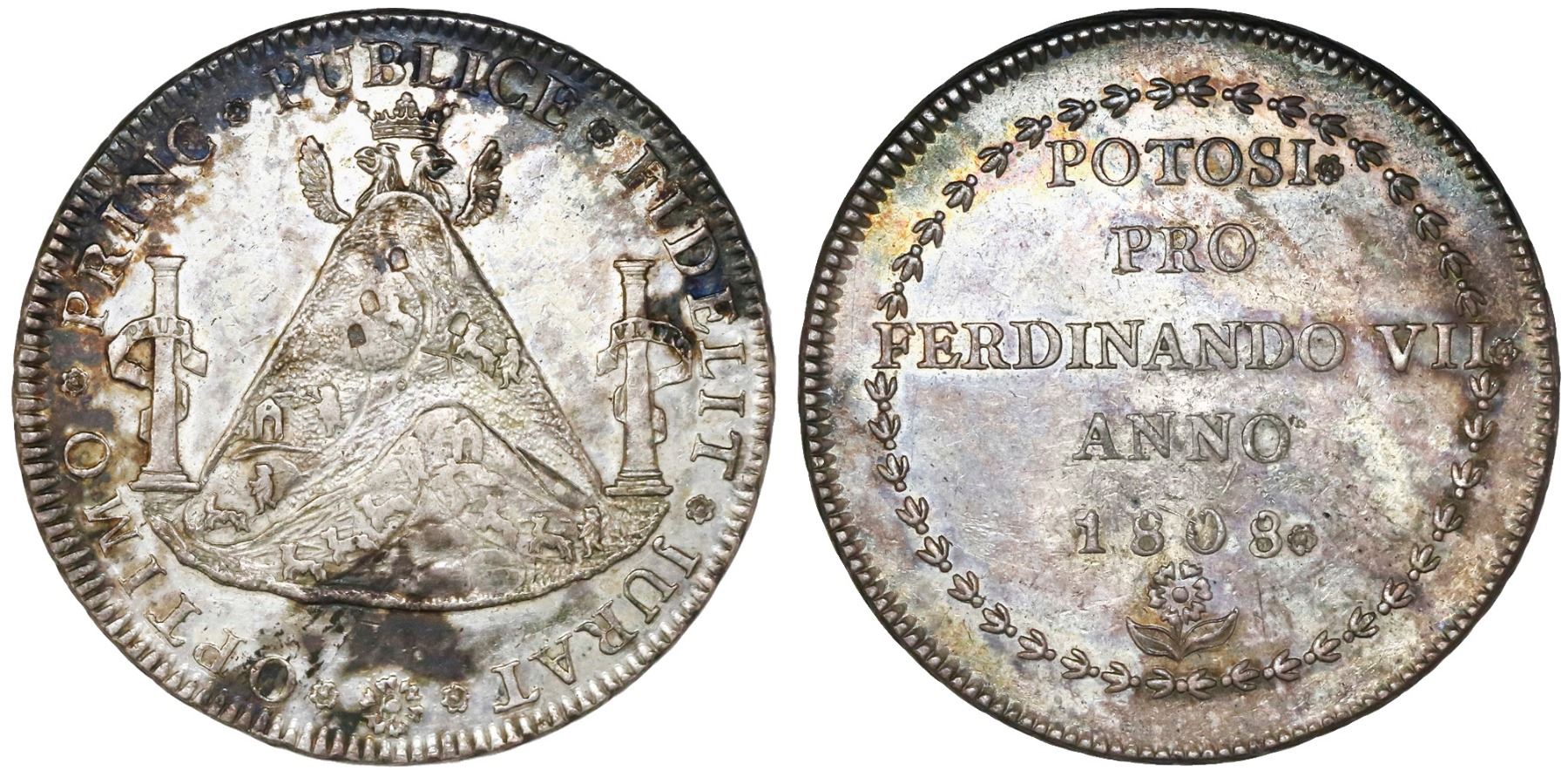 Potosi, Bolivia, 8 reales-sized silver proclamation medal, Ferdinand VII, 1808, ex-Cotoca. Medina-346; Fonrobert-9392. 27.04 grams. Obverse with mountain between pillars inside legend OPTIMO PRINC PUBLICE FIDELIT JURAT; reverse with POTOSÍ / PRO / FERDINANDO VII / ANNO / 1808 above flower within wreath. Lustrous AU, some surface contact marks, mottled rainbow toning all over, mark-free rims. Pedigreed to the Cotoca collection.
