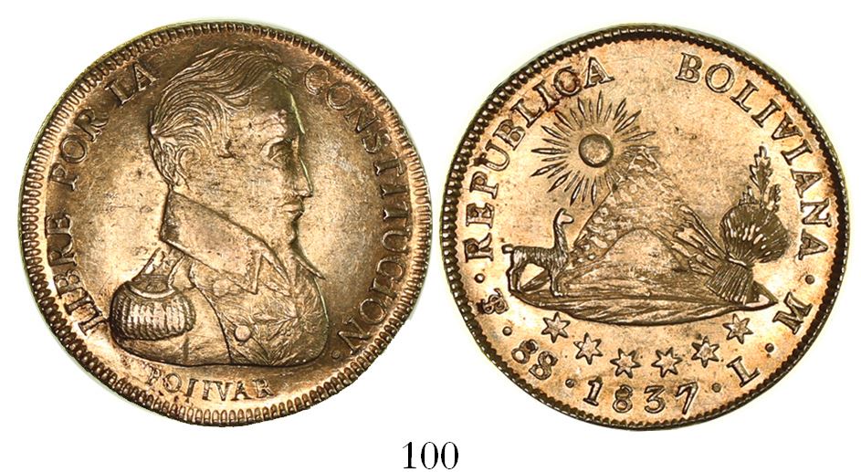 Potosi, Bolivia, 8 scudos, 1837LM. KM-99. 27.05 grams. Lustrous UNC with scratches below Bolivar's right shoulder, surface hairlines in fields, very flashy and popular.