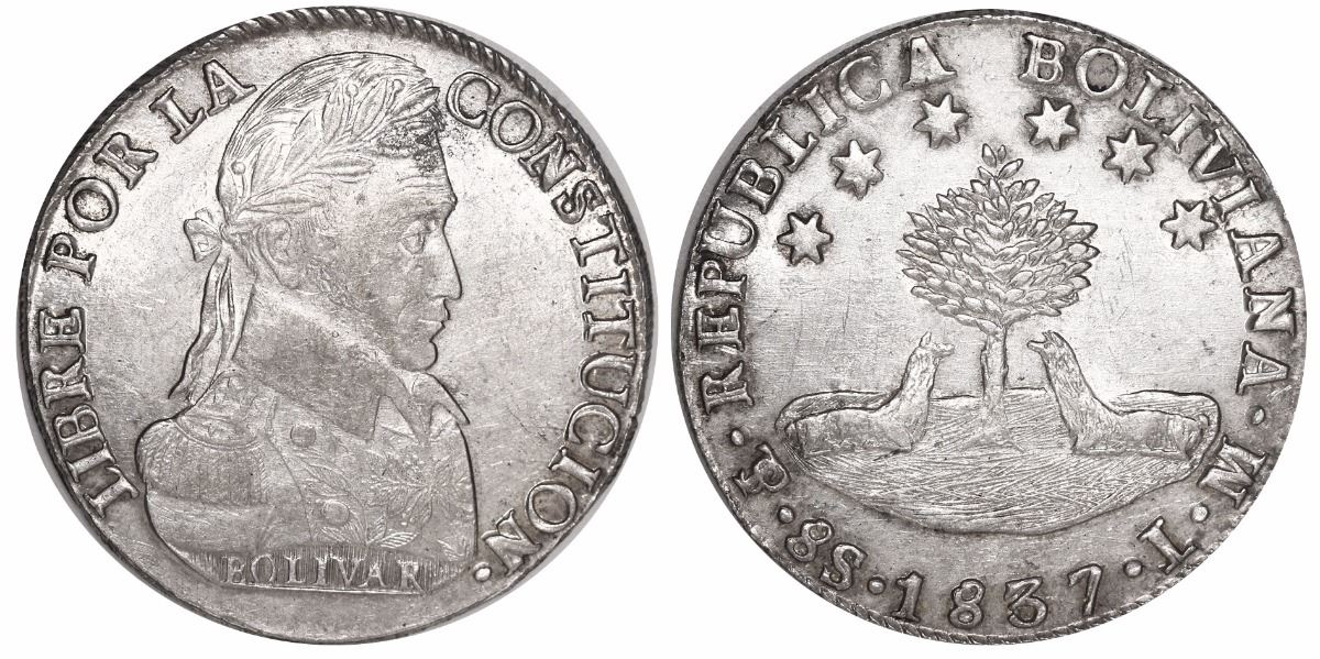 Potosi, Bolivia, 8 soles, 1837LM. 27.14 grams. Lustrous AU with light surface hairlines, incipient toning.