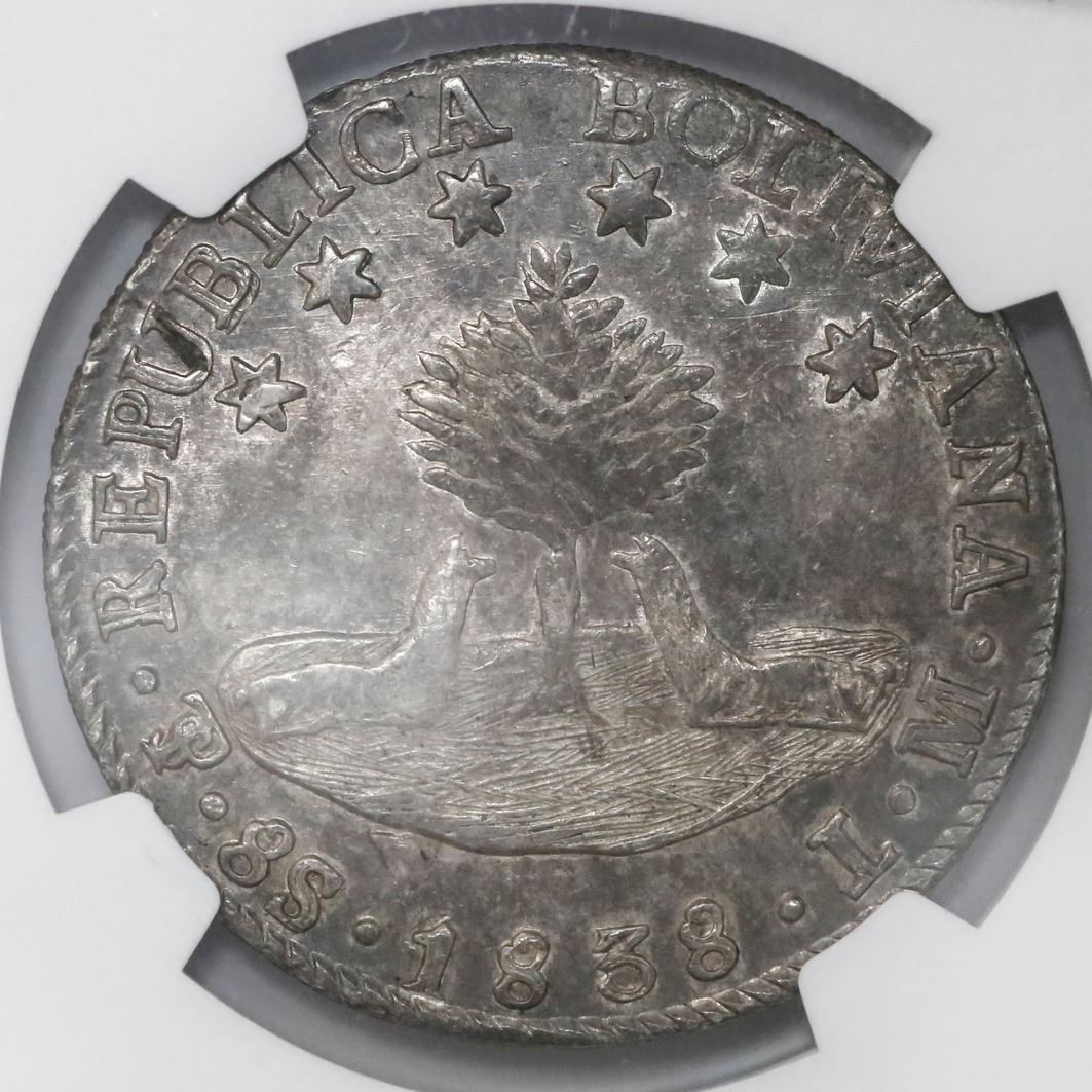 Potosi, Bolivia, 8 soles, 1838LM, NGC AU 55.