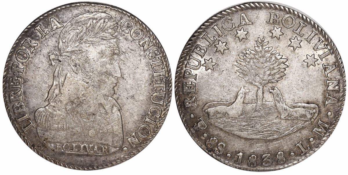 Potosi, Bolivia, 8 soles, 1838LM. 26.97 grams. XF+ with hint of luster and toning, strange old marks on face.
