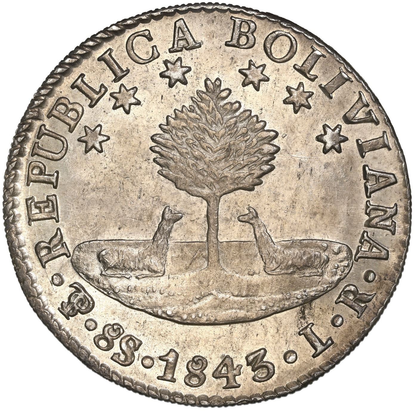 Potosi, Bolivia, 8 soles, 1843 LR, NGC MS 62 ( top pop ), ex-Millennia.