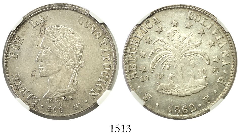 Potosi, Bolivia, 8 soles, 1862FP, encapsulated NGC AU 55. KM-138.6 Slightly matte fields with luster around details, nice strike for the issue.