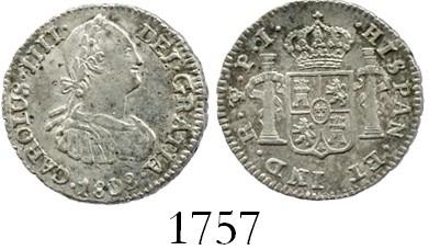 Potosi, Bolivia, bust 1/2 real, Charles IV, 1808PI (erroneous assayer-mark). KM-unl. (cf. 69); CT-unl. (cf. 1325). 1.7 grams. Lustrous Mint State with subtle toning, interesting error (unlisted and presumably rare).