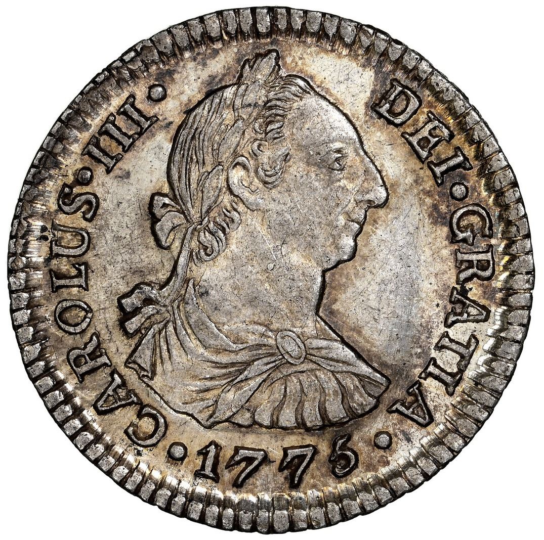 Potosi, Bolivia, bust 1 real, Charles III, 1775 JR, NGC MS 63+, finest known in NGC census. Janson-66.3.1; KM-53; Cal-716. Broad flan with full rims, gorgeous full luster, traces of rainbow toning around details, far and away the finest graded by NGC (next best being AU 58).
