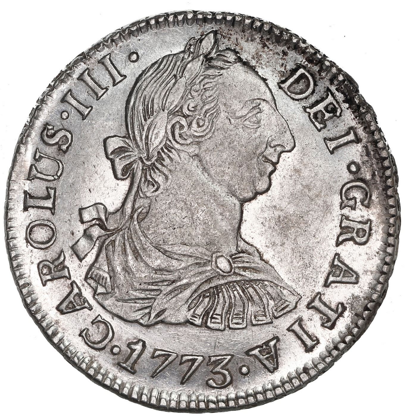 Potosi, Bolivia, bust 2 reales, Charles III, 1773 JR, NGC MS 61, finest known in NGC census.