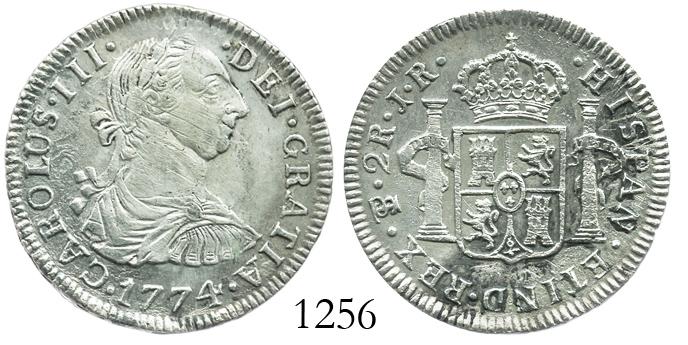 Potosi, Bolivia, bust 2 reales, Charles III, 1774JR. KM-53; CT-1383. 6.7 grams. Bold XF+ with abrasions on bust and partially corroded as from unspecified salvage, also lustrous but with some dark toning.
