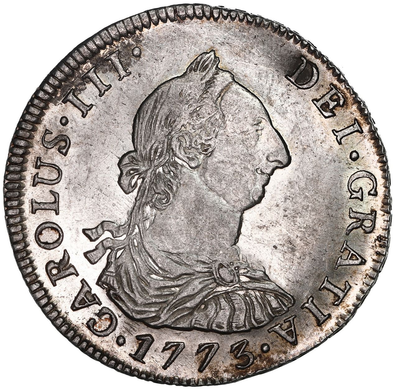 Potosi, Bolivia, bust 4 reales, Charles III, 1773 JR, with dot above mintmark, NGC MS 62, finest known in NGC census. Janson-64.1.4; KM-54; Cal-929. With mirror luster and light gold toning, just a bit weakly struck in the crown, this is the sole finest for the desirable first year of issue, also a scarce variety (not noted by NGC).