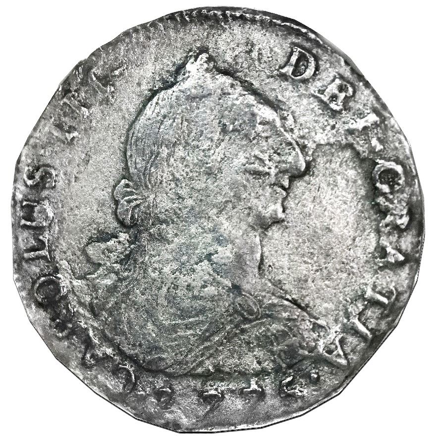 Potosi, Bolivia, bust 4 reales, Charles III, 1775JR, NGC El Cazador / genuine. KM-54; Cal-932. Clear VF/XF details despite light corrosion (heavier at rims, which are mostly gone), some dark areas, rare denomination for this wreck. NGC #3356944-031. From: Cazador, sunk in 1784 off New Orleans, Louisiana