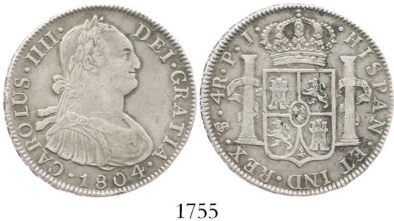 Potosi, Bolivia, bust 4 reales, Charles IV, 1804PJ. KM-72; CT-881. 13.3 grams. Beautifully old-toned AXF, very attractive.