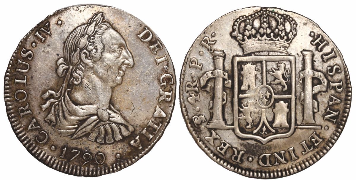 Potosi, Bolivia, bust 4 reales, Charles IV transitional (bust of Charles III, ordinal IV), 1790PR. 13.39 grams. Bold VF with polished surfaces, toning around details, slightly off-center strike.