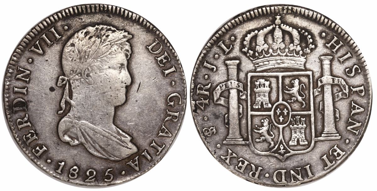 Potosi, Bolivia, bust 4 reales, Ferdinand VII, 1825JL. 13.43 grams. Bold VF with nice toning, final date of colonial issues. With National Numismatic Certification tag VF-35.