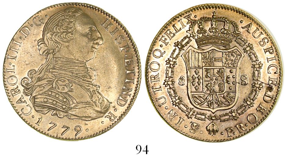 Potosi, Bolivia, bust 8 escudos, Charles III, 1779PR. CT-145; KM-59. 26.91 grams. AU- with minor marks in obverse fields, highly lustrous reverse with one tiny lamination, choice grade for this scarce date.